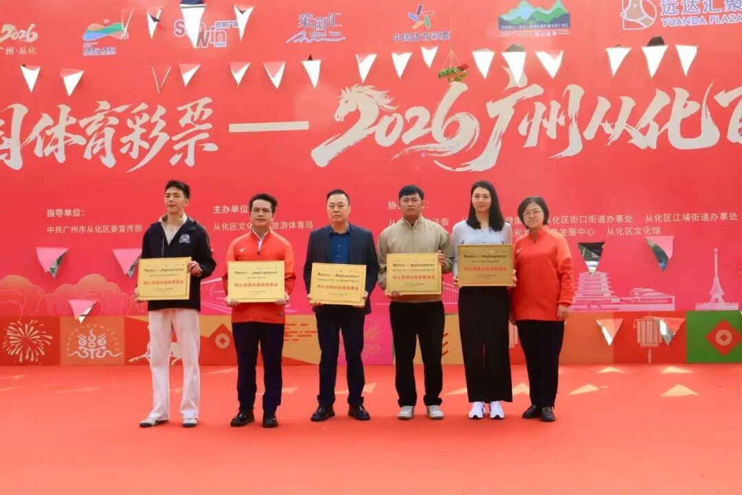 活动现场授予莱茵汇大广场、欣荣广场、远达汇聚广场、广州市从化区流溪中学、广州市从化区龙狮武术协会“热心支持从化体育事业”荣誉牌匾。随后进行醒狮采青,雄狮寻青、采青、吐青动作刚劲灵动,尽显从化醒狮魅力。采青以从化荔枝、生菜为载体,寄寓发展红火、财源广进的美好期许。最后,嘉宾领导为醒狮点睛,六步点睛为醒狮赋灵,送上满满的美好祈愿。